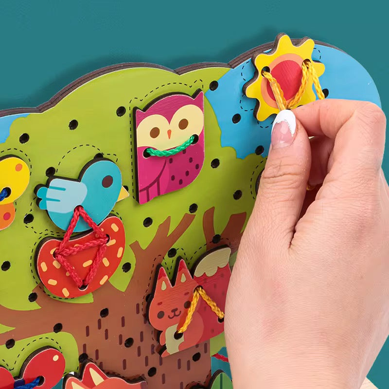 Un arbre coloré à lacer : Avec ses adorables motifs de papillons, hiboux, renards et feuillages, l'enfant s'amuse à passer les lacets à travers les piÚces pour enrichir sa dextérité.