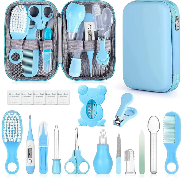 - Contenu : Total de 13 pièces soins bébé. 3 pour cheveux : peigne, brosses à cheveux , 5 pour soin quotidien : pince à nez, lime à ongles, coupe-ongles, boule d'oreille led et ciseaux à bout rond. 3 pour bucco-dentaire : anneau de dentition, brosse à dents à doigts, 3 pour santé : compte-gouttes, aspirateur nasal, thermomètre digital. Un sac de rangement bleu est inclus.