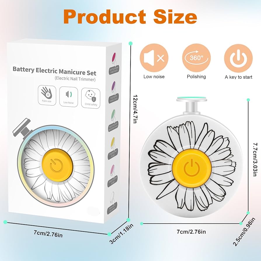 Chaque accessoire de meulage est soigneusement conçu pour s'assurer qu'il élimine les bords tranchants des ongles tout en étant doux et inoffensif pour les ongles et la peau délicats de bébé. Il empêche efficacement votre bébé de se blesser à cause d'une coupe manuelle incorrecte Low Noise Technology:Durant l'utilisation, le bruit de la lime à ongles est aussi bas que les décibels, ce qui n'effraie pas votre bébé ou ne perturbe pas son sommeil, convenant à l'utilisation lorsque votre bébé est endormi pour éviter les pleurs