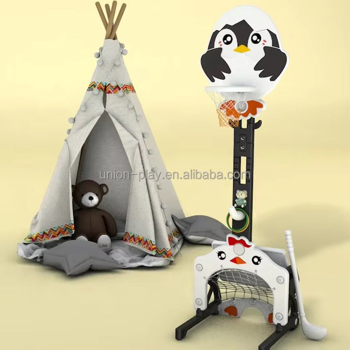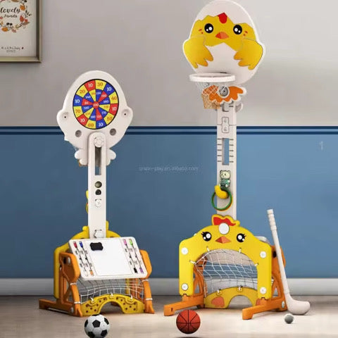 Offrez à votre enfant un centre de jeu multifonction pour des heures de divertissement et d’apprentissage ! Ce jouet 4 EN -1 propose un panier de basket, une cage de football, cible ring ; un jeu de hockey. Conçu avec un design adorable en forme de poussin, il stimule la motricité, la coordination et la créativité des petits tout en leur permettant de s’amuser en toute sécurité.